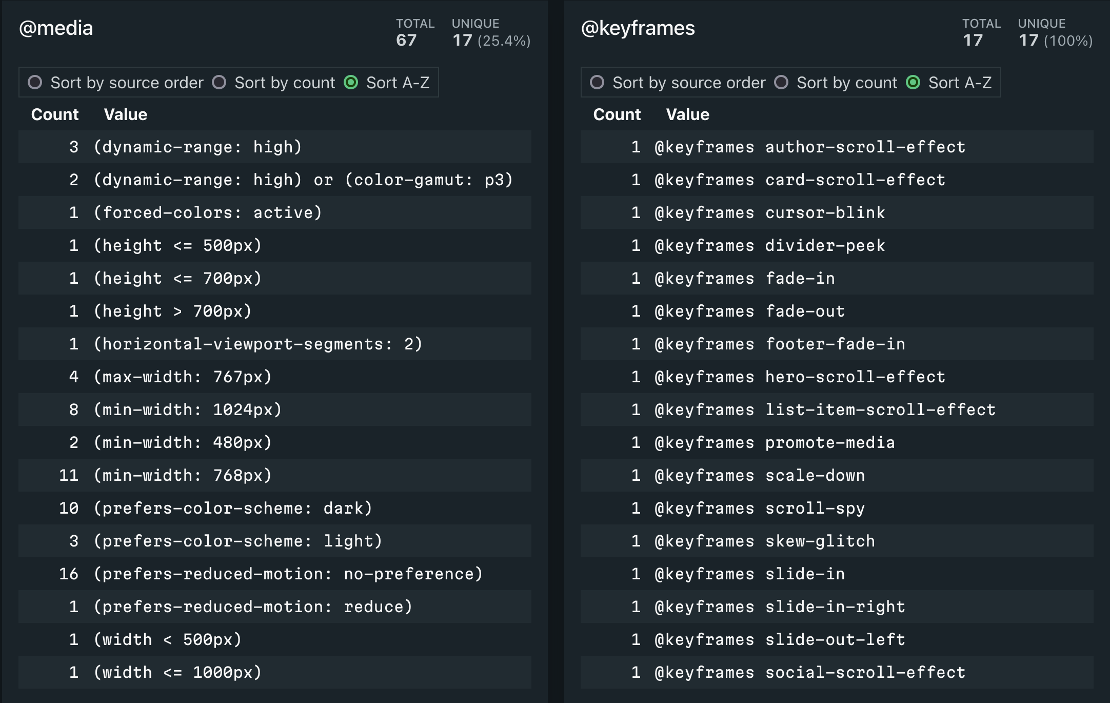 • Many sections of the css analysis and design tokens pages can be sorted by source order or by count. Many of them can now also be sorted alphabetically. This can lead to better discoverability of issues. Try sorting media queries or selectors alphabetically and you’ll see why this exists.